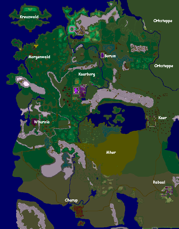 Die Nordlande werden im Norden und Westen vom Meer begrenzt. Im Osten beginnen die Steppen oder Orklande. Die noerdlichsten Gebiete werden von einem maechtigen Gebirgszug bedeckt, der nur an der Kueste entlang zu umgehen ist. Ein Weg durch das Gebirge nach Norden ist nicht bekannt. Die Kuesten im Norden sind nur vereinzelt von Barbaren besiedelt. Große Teile sind durch dichte Waelder bedeckt, die den Namen Finsterwald tragen. Der westliche Teil der Nordlande ist ebenfalls von Wald bedeckt und wird von Elfen bewohnt. Die Waelder werden Morgenwald oder Elfenwald genannt. Im Westen hinter dem Horizont des Meeres soll eine Insel liegen, die nur von Elfen bewohnt wird. Den Mittelteil der Nordlande bis nach Osten zu den Steppen bewohnen im wesentlichen Menschen. Das Land hat keine einheitliches Erscheinungsbild. Mittelgebirge , Taeler, weite Ebenen und Huegel wechseln sich ab. Im Norden vor dem Gebirge ist ein Binnenmeer. Ein grosser Fluss kommt von Sueden und biegt dann vor dem Binnenmeer und dem Gebirge im Norden nach Westen zum Meer ab. Er teilt das Land aber ist auch eine wichtige Handelsstrasse. Der Fluss teilt das Land in einen West- und einen Ostteil. Der Ostteil grenzt direkt an die Steppen und das Orkland.